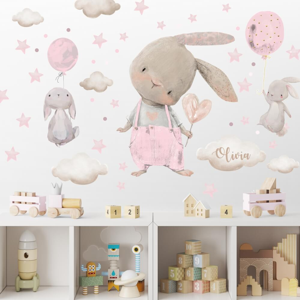 matricák gyerekeknek - aranyos nyuszi akvarell stílusban, lufikkal, névvel és csillagokkal.