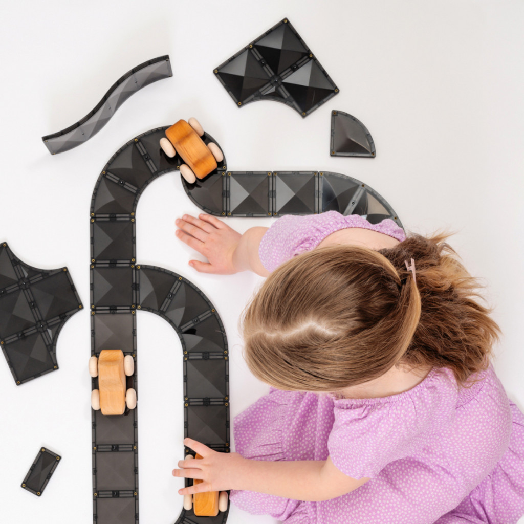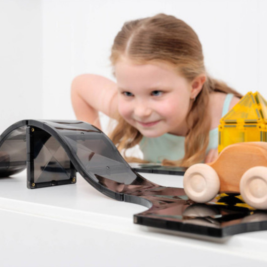 • Exkluzív fekete dizájn: A fekete elemek eleganciát és kontrasztot visznek a színes vagy pasztell építmények közé. Mivel nincsenek rajtuk festett fehér vonalak, a nyílt végű játék jegyében bármivé átalakulhatnak: kifutópályává, modern tetőszerkezetté vagy nindzsa pályává.