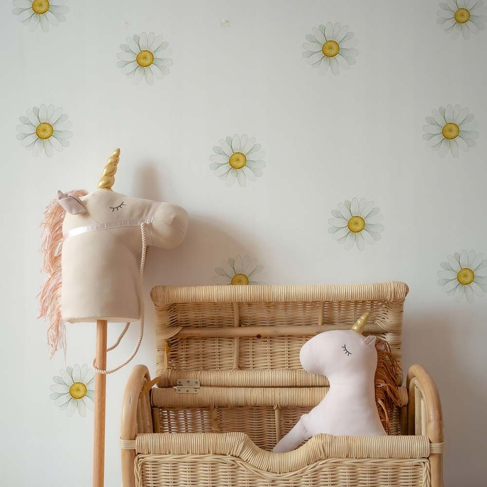 Ezek a matricák nem csupán dekorációk, hanem a nyugalom szigetei. A digitális akvarell technika olyan lágy és finom textúrát ad a margarétáknak, mintha egy művész kézzel festette volna őket közvetlenül a falra. A selymes matt felület nem veri vissza a fényt, így minden napszakban természetes látványt nyújt. Tökéletesen passzol a Little Dutch virágos és natúr kollekcióihoz, de bármilyen skandináv vagy bohó stílusú gyerekszobában megállja a helyét.