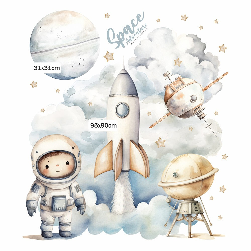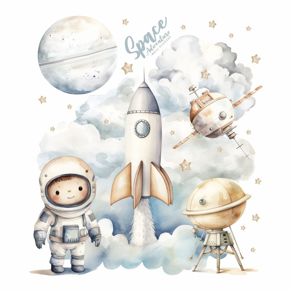 Ha a gyermeked rajong a csillagokért és az űrutazásért, ez a „Space Adventure” falmatrica szett tökéletes választás lesz számára. A bájos kis űrhajós, a rakéta, a bolygók és a csillagok akvarell stílusban készültek, így egyszerre keltenek mesés és megnyugtató hatást. Tökéletes dekoráció babaszobába, kisfiús birodalomba vagy játszósarokba.