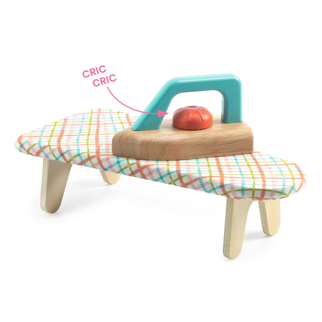 A csomag egy komplett "kis mosodát" rejt: 1 db stabil, fa lábakkal rendelkező vasalódeszkát illusztrált huzattal, 1 db ergonomikus fa vasalót és 5 db különböző, "vasalható" játék ruhadarabot. Minden adott az azonnali játékkezdéshez.