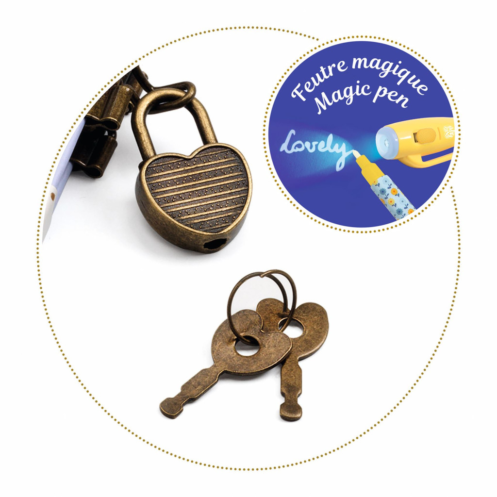 A Djeco napló kettős védelmet nyújt: egyrészt a fém lakat fizikailag zárja le a lapokat, másrészt a láthatatlan írás miatt nyitott állapotban sem olvasható a szöveg UV-fény nélkül. A csomagban 2 db kulcs található a lakathoz.