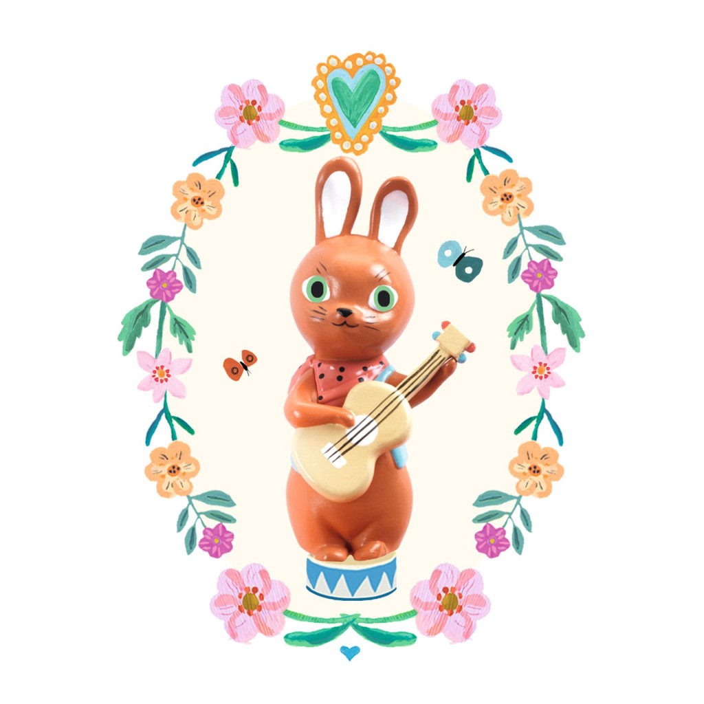 • Interaktív élmény: A hátul található kulcs felhúzása után, a fedél nyitásakor felcsendül Antoine Renard dala, miközben a gitározó nyuszi körbe-körbe forog.