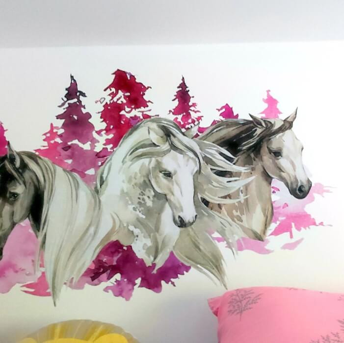 Áthelyezhető falmatrica lányos szobába közkedvelt lovas motívummal rózsaszín árnyalatokban.