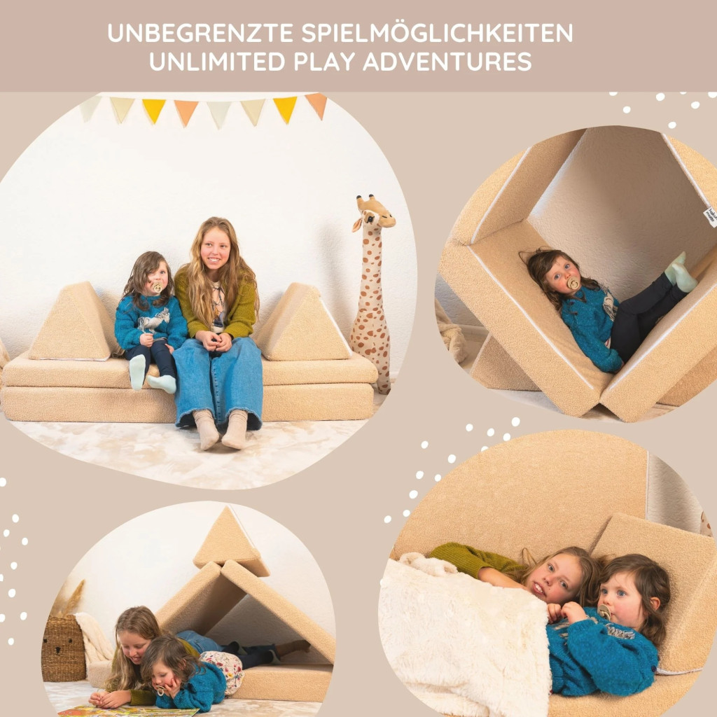 • Gyermekbarát kialakítás: Lekerekített formák, rejtett cipzárak és puha felületek biztosítják a veszélytelen játékot
