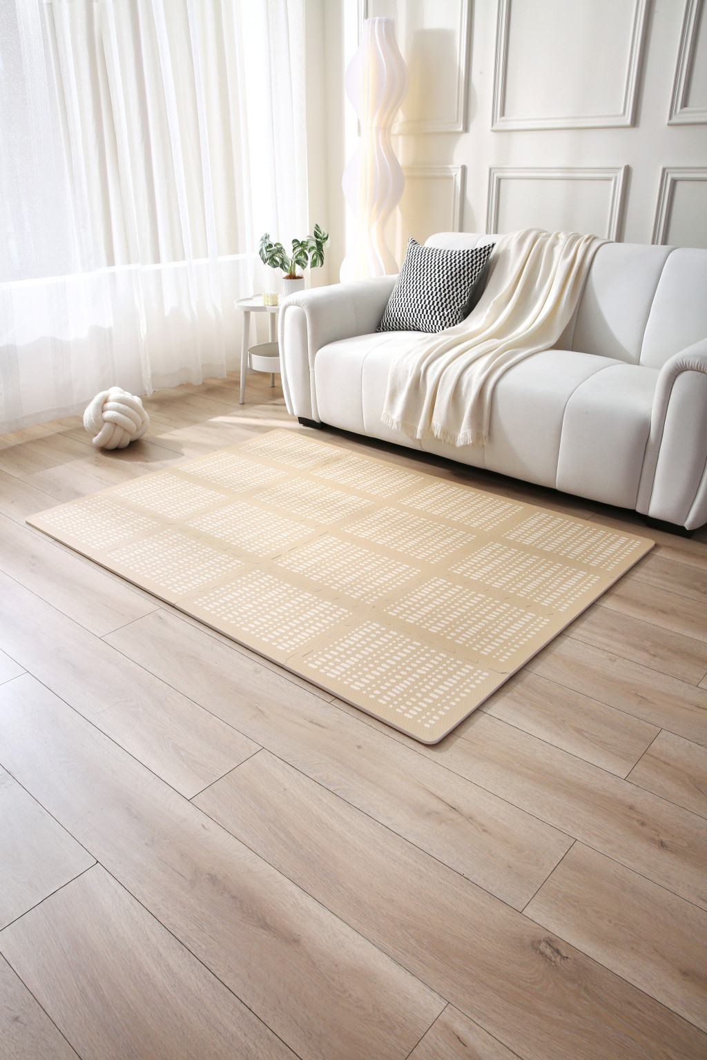 Ezt a szőnyeget kifejezetten esztétikus, skandináv szemlélettel tervezték. A homokszín (Sand) és a letisztult pöttyös minta nem töri meg a lakás harmóniáját, így a gyereksarok nem egy harsány "sziget" lesz, hanem a nappalid stílusos kiegészítője.