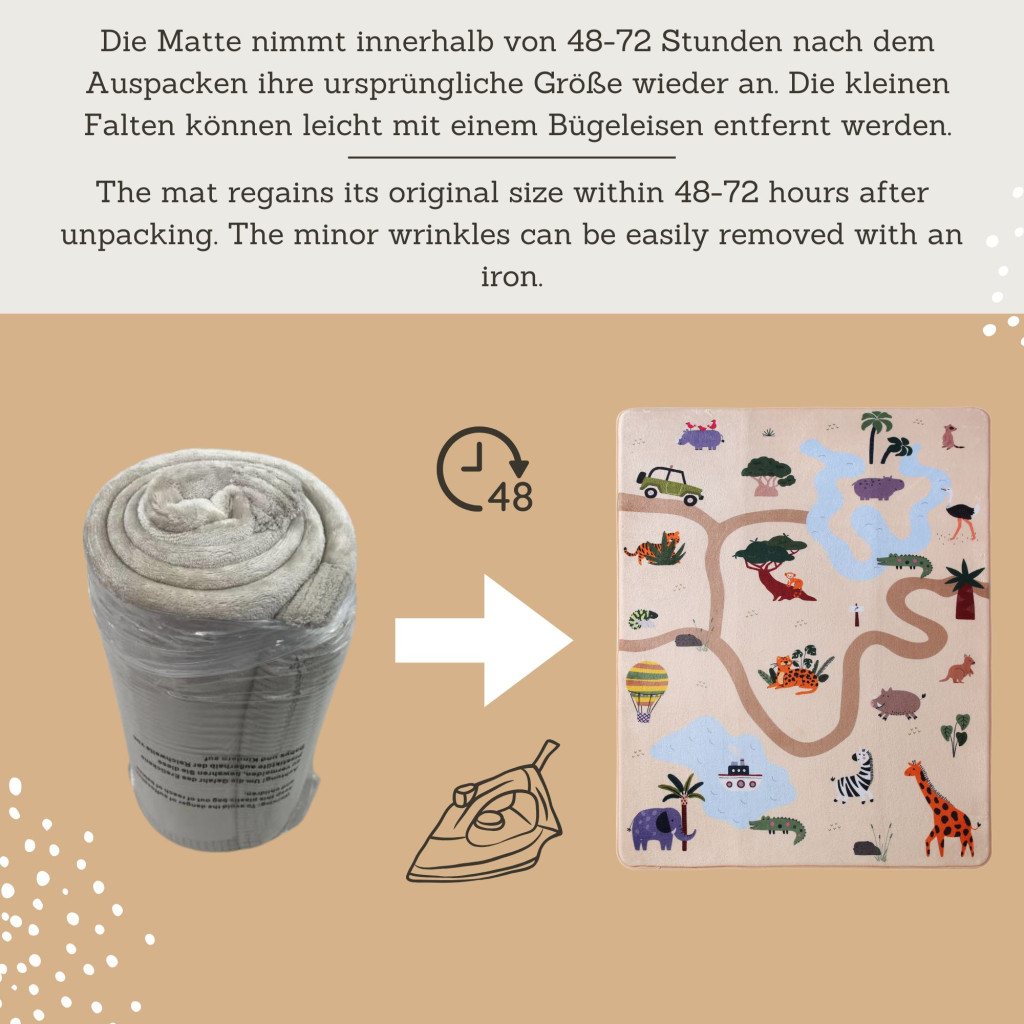 A földszínekre épülő, mégis vidám és élénk részletekkel gazdagított dizájn ösztönzi a kreatív játékot és a történetmesélést, miközben a gyermekek fejlődnek és felfedezik a világot. A 1,5 cm vastag memóriahab extra puhaságot biztosít, a csúszásmentes alsó réteg pedig gondoskodik a stabilitásról.