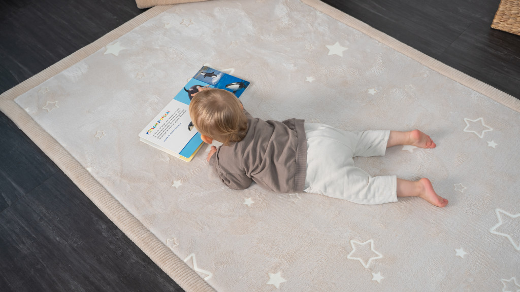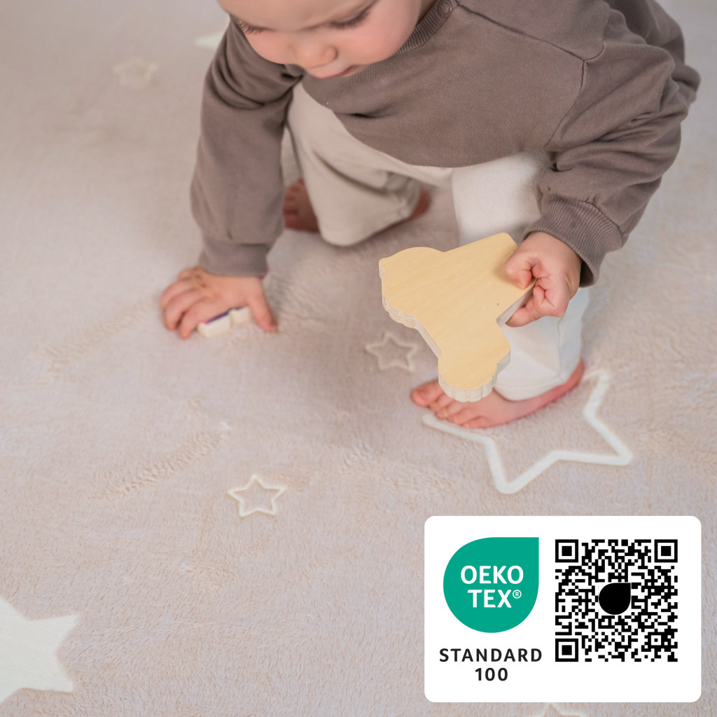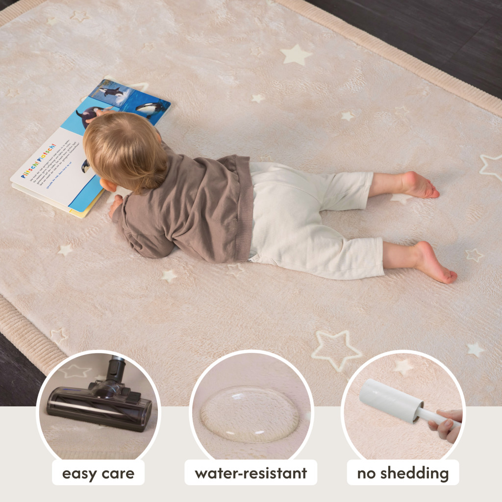 Varázsold a gyerekszobát a nyugalom szigetévé! Nappal a kifinomult bézs árnyalatú szőnyeg stílusos, semleges kiegészítője a térnek, ahol gyermeked biztonságban játszhat, építhet vagy olvashat a puha felületen. A vízlepergető réteg gondoskodik róla, hogy a kilöttyent italok se okozzanak gondot. Este pedig, lámpaoltás után megtörténik a csoda: a szőnyeg világító csillagai felragyognak, mintha csak a szabad ég alatt feküdnétek, megnyugtató vizuális élményt nyújtva az elalváshoz.