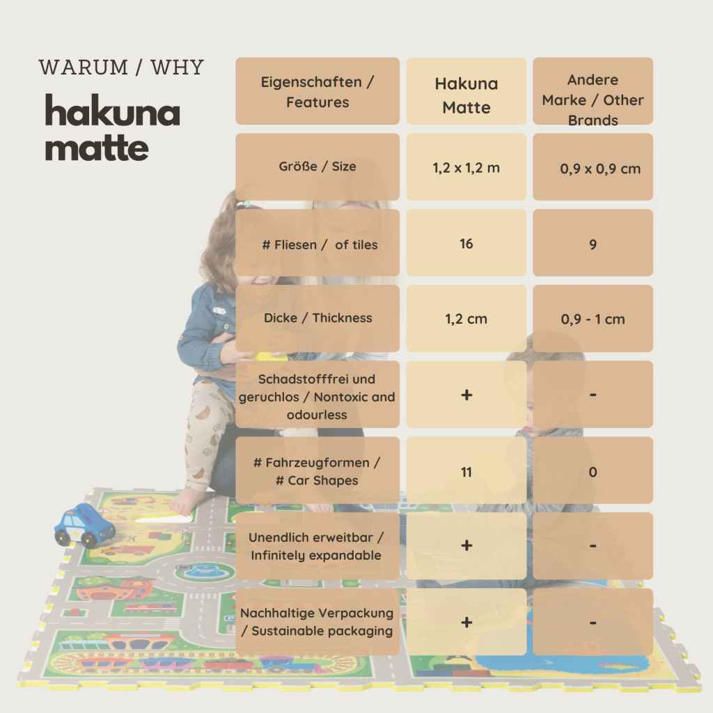 A Hakuna Matte puzzle szőnyeg nemcsak szórakoztató, hanem praktikus is. Végtelenül bővíthető, így több szőnyeget is összeilleszthetsz, hogy egy hatalmas játszóvárost hozhass létre gyermeked számára. Legyen szó egy délutáni beltéri játékról vagy egy szabadtéri kirándulásról, ez a szőnyeg bárhol használható, és könnyen tisztítható.
