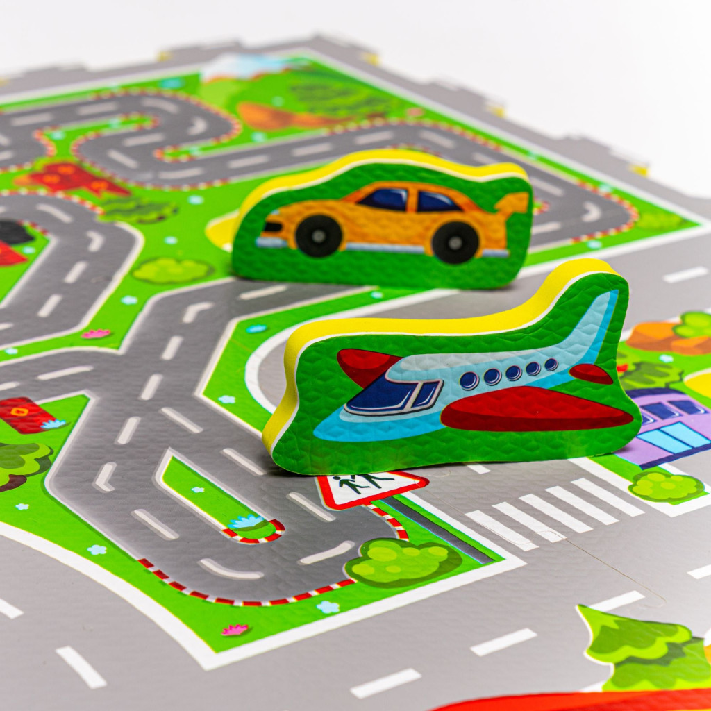 Azért választottuk, mert vastagabb, mint általában a habszivacs szőnyegek, és a különlegessége, hogy bizonyos elemei (a járművek és a lovacska) kipattinthatóak a szőnyegből, így egy óriási formabeillesztő játékként is funkcionál.
