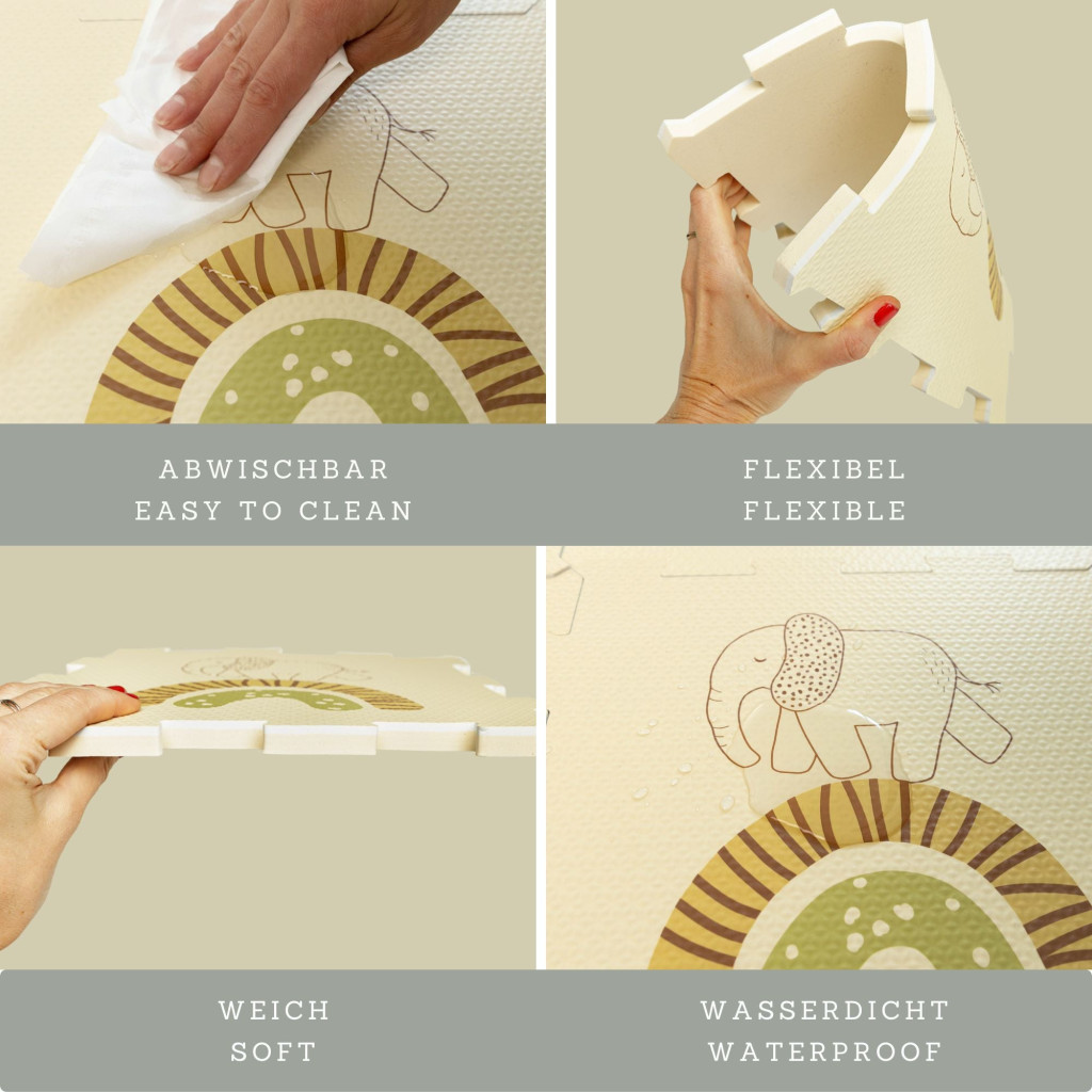 A Hakuna Matte puzzle játszószőnyeg – Szafari modern és praktikus megoldást kínál minden gyerekszobába. A letisztult, nemekhez sem kötődő pasztellszínek és a kézzel rajzolt dzsungelállatok és növények motívumai stílusosan illeszkednek bármilyen környezetbe. A 1,2 cm vastagságú szőnyeg extra puhaságot és kényelmet nyújt, messze felülmúlva a hagyományos 0,9-1 cm-es változatokat. A 12 élvédő biztosítja, hogy a szőnyeg egybefüggő, esztétikus megjelenést kapjon. A szőnyeg végtelenül bővíthető, hiszen több darab is összeilleszthető. 100%-ban biztonságos, kiváló minőségű EVA habszivacsból készült, ami garantálja a maximális védelmet és kényelmet.