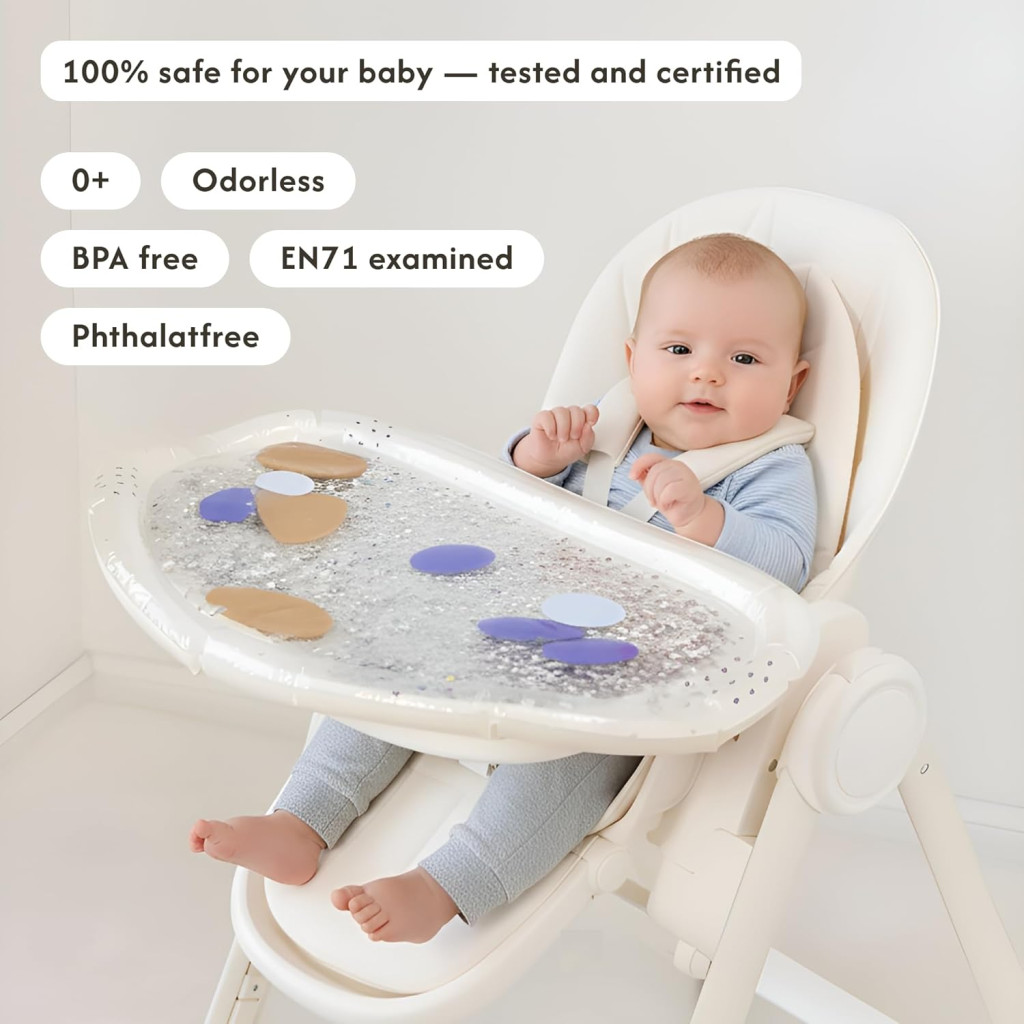 • Az etetőszék tálcáján: Méretének köszönhetően tökéletesen elfér a legtöbb etetőszék tálcáján. Kiváló trükk, ha le akarod kötni a kicsit, amíg elkészíted az ebédjét, vagy ha szeretnéd fejleszteni az ülőegyensúlyát.