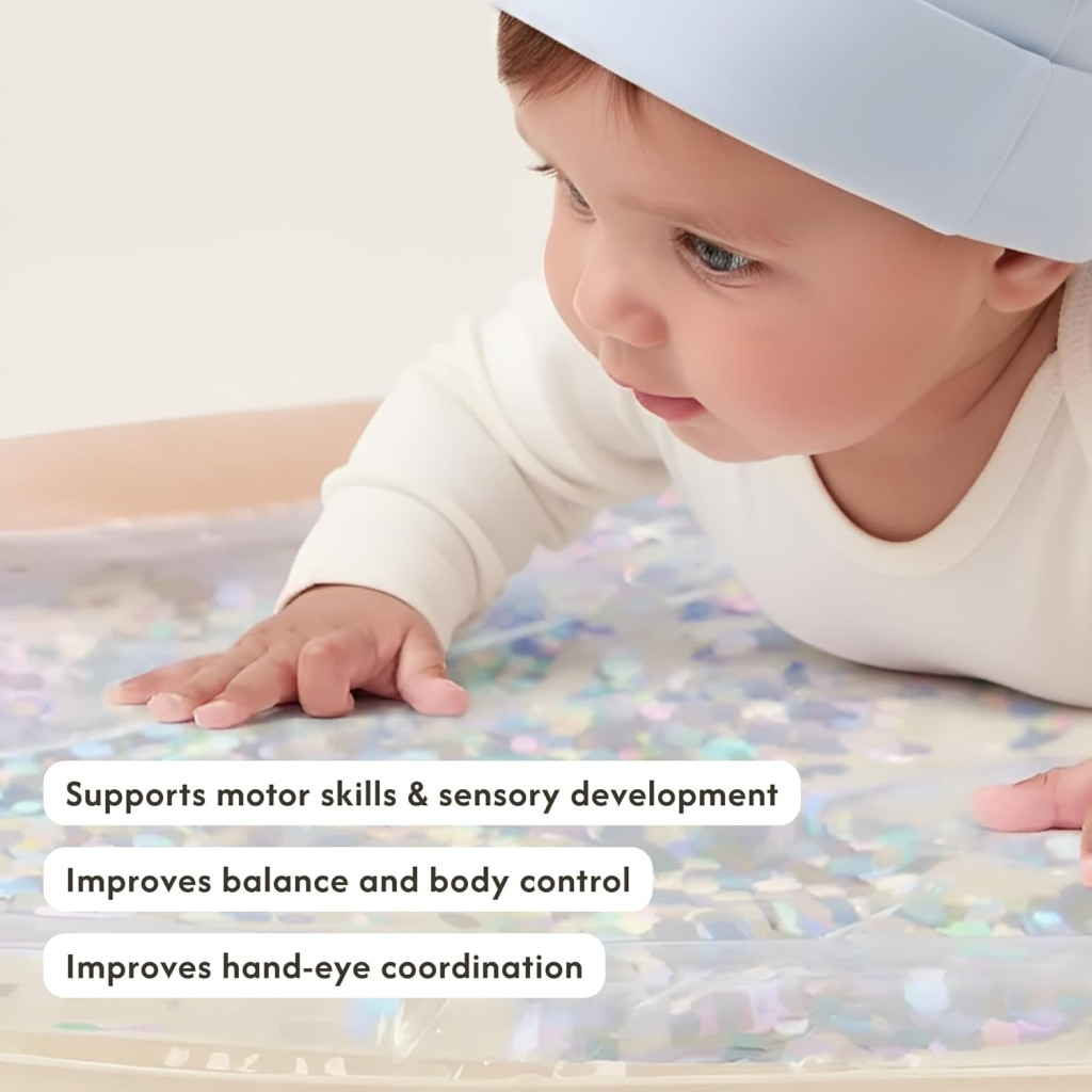 A kisbabák mozgásfejlődésének egyik legkritikusabb pontja a hasalás (tummy time), ám sok pici számára ez a pozíció kényelmetlen és sírásba torkollik. A Hakuna Matte ezt a kihívást változtatja meg: a vízzel töltött, lágyan mozgó felület és a benne úszó csillogó formák annyira lekötik a baba figyelmét, hogy észre sem veszi az erőfeszítést. Ez nem csupán egy játék, hanem egy stílusos fejlesztőeszköz, amely a modern otthonok harmonikus kiegészítője.
