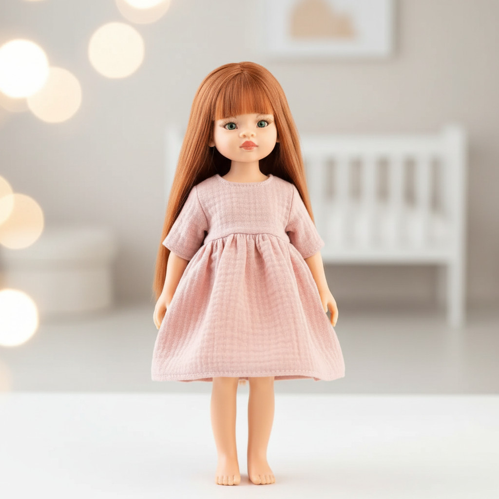 Ez a muszlin ruha kifejezetten a Paola Reina Amigas 32 cm-es babák számára készült, de más, hasonló méretű játékbabákhoz is tökéletes. Könnyed, szellős anyaga és letisztult fazonja miatt praktikus választás a mindennapi játékhoz.