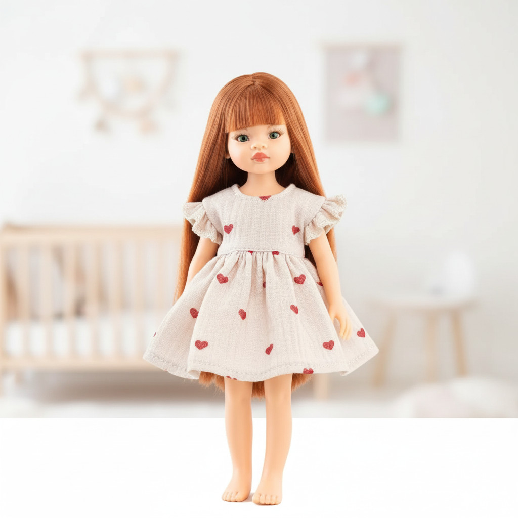 Ez a szívecskés muszlin ruha kifejezetten a Paola Reina Amigas 32 cm-es babák számára készült, de más, hasonló méretű babákhoz is tökéletesen passzol. Könnyed anyaga és a vidám minta igazán különlegessé teszi a mindennapi játékot.