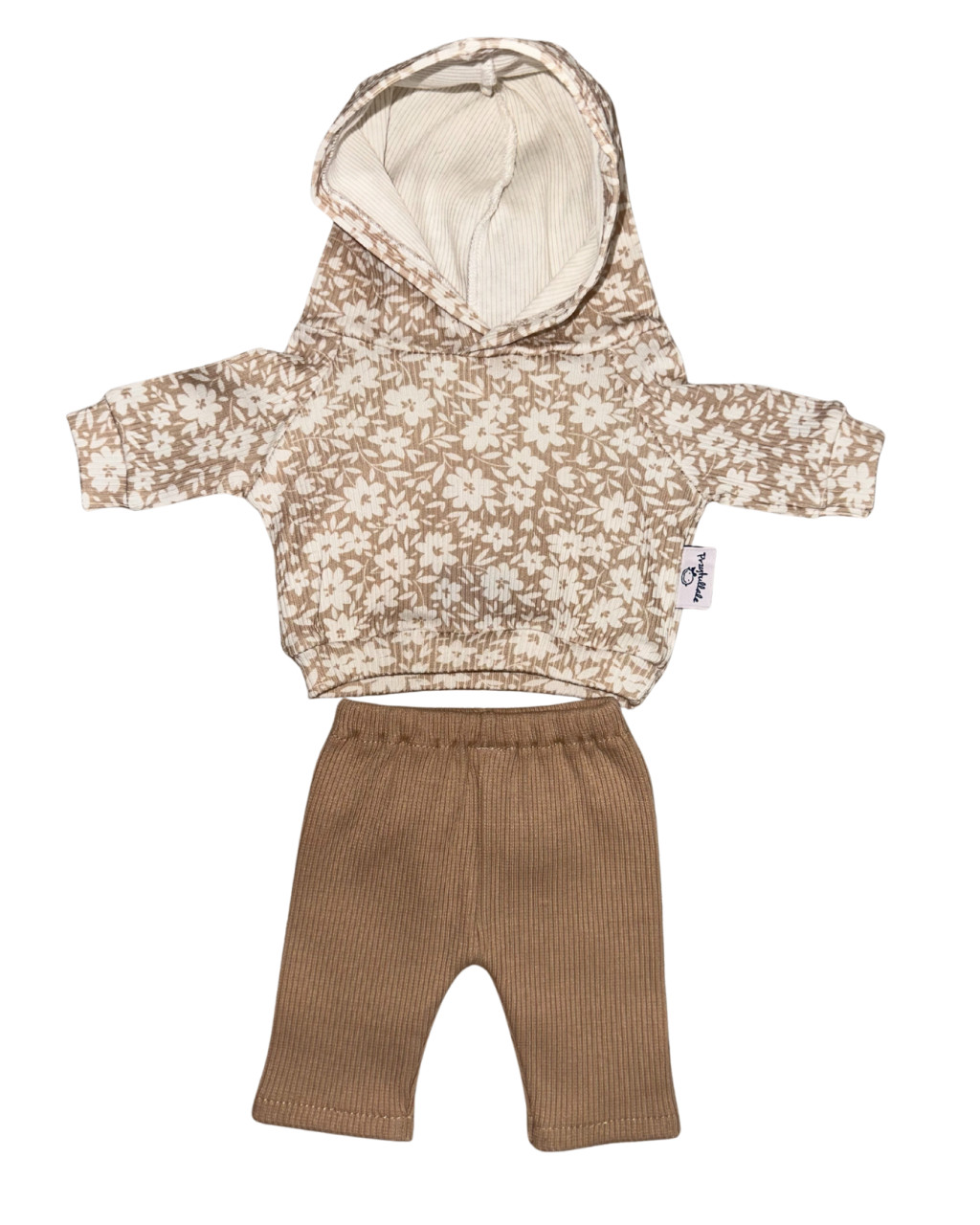 Ez a puha baba szett egy bájos, virágmintás kapucnis pulcsiból és egy kényelmes, bordázott leggingsből áll. Letisztult, mégis játékos darabok, amelyek tökéletesen illenek a Minikane 34 cm-es, a Paola Reina 34 cm-es, valamint más, hasonló méretű babákra.