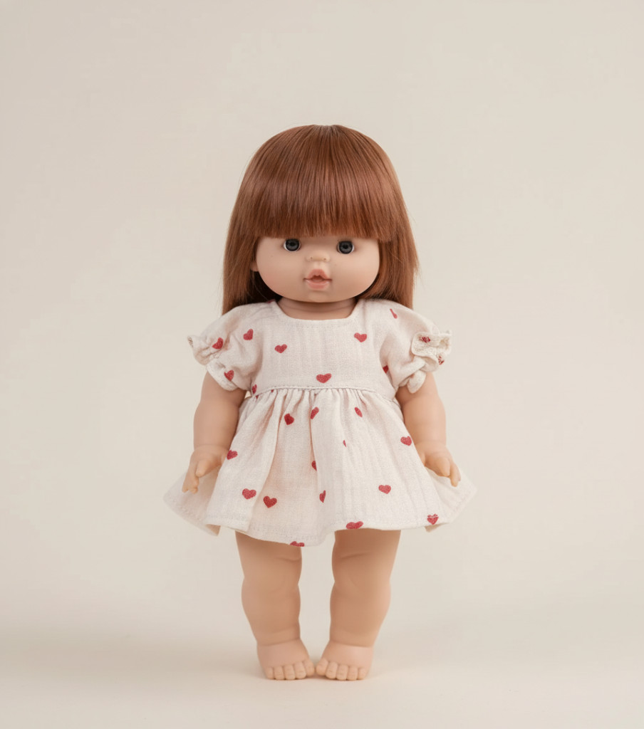 Ez a bájos kis ruha kifejezetten Minikane 34 cm-es, Paola Reina 34 cm-es és más, hasonló méretű babák számára. A krémszínű, szívecskés muszlin anyag és a hozzá illő hajpánt igazán kedves megjelenést ad a babának. A ruha tépőzárral záródik, így a kicsik önállóan is könnyen fel tudják adni – a hajpánt pedig a játék egyik legédesebb kiegészítője lesz.