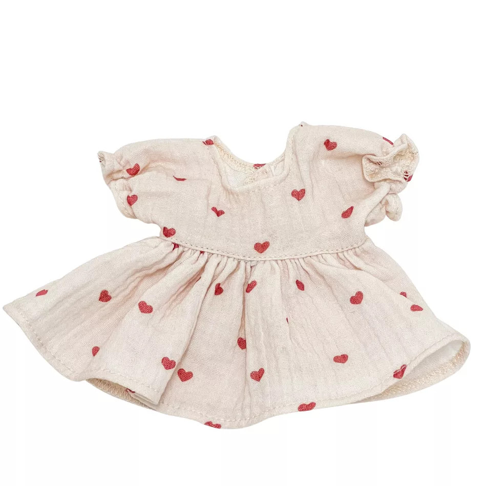 Képzeld el, ahogy a gyereked öltözteti a kedvenc Minikane babáját ebbe a kis szívecskés ruhába. A természetes muszlin anyag könnyű és puha, így ideális a mindennapi játékhoz. A kislányok imádni fogják, hogy a hajpántot saját kezűleg köthetik meg – ez a kis részlet még személyesebbé teszi a játékot.