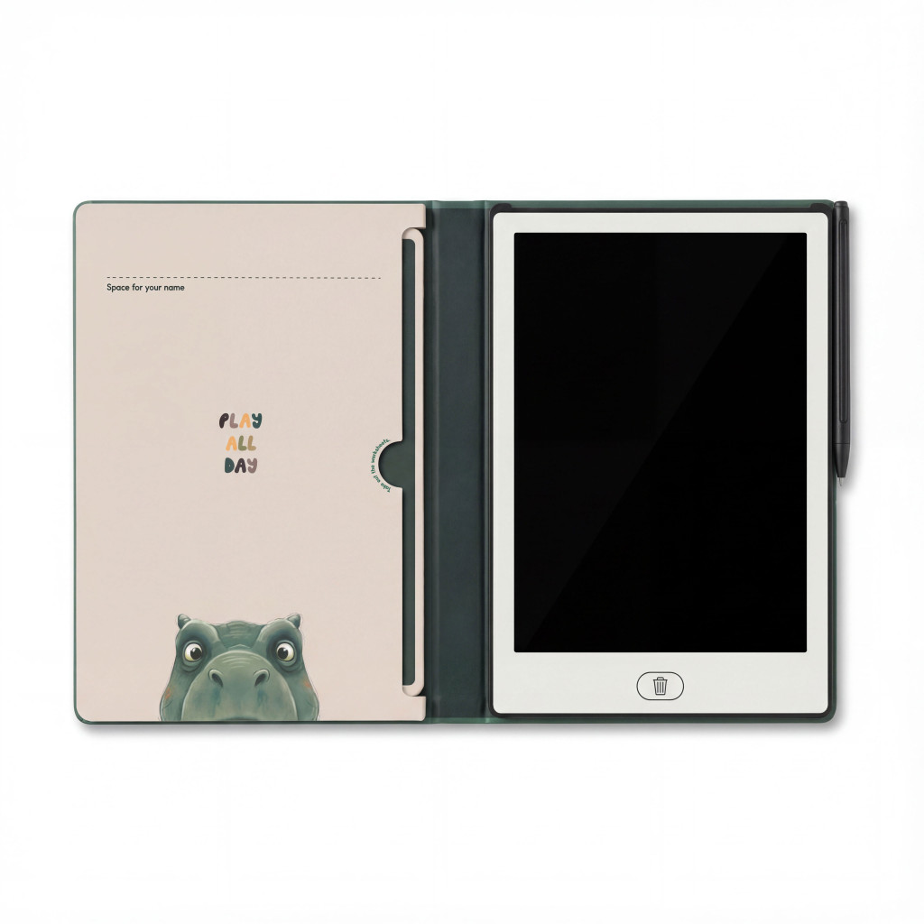 A KidBook egy elegáns, füzet-szerű tok, amelynek jobb oldalán található az LCD rajztábla, bal oldalán pedig a 20 darab kétoldalas munkalap. A gyermek kiválasztja a feladatot, és a stylus toll segítségével a táblán gyakorolhatja a látottakat, vagy akár a saját fantáziájára bízva alkothat a szabad oldalakon.