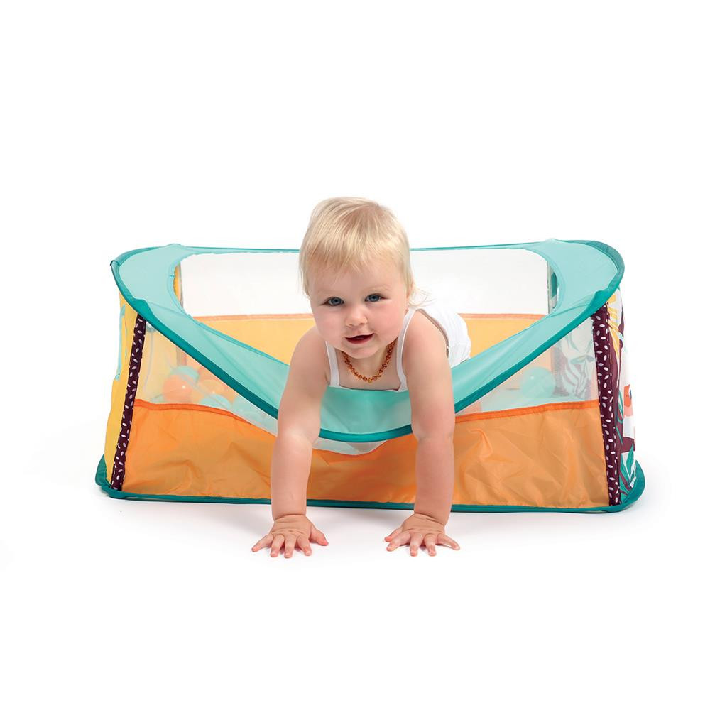 A LUDI dzsungel mintás pop-up labdamedence egy igazi kis játszósarok, ami pillanatok alatt készen áll a mókára – otthon, nyaraláson vagy akár a nagyinál.