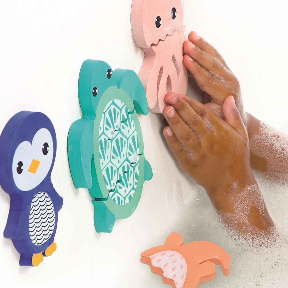 Ez a kedves fürdős puzzle minden esti fürdésből élményt csinál. A teknős, a vidra, a polip és a pingvin alig várják, hogy a kicsivel együtt csobbanjanak. Ez a játék pont arra való, amikor szeretnéd, hogy a fürdés ne csak rutinfeladat legyen, hanem közös móka és tanulás is.