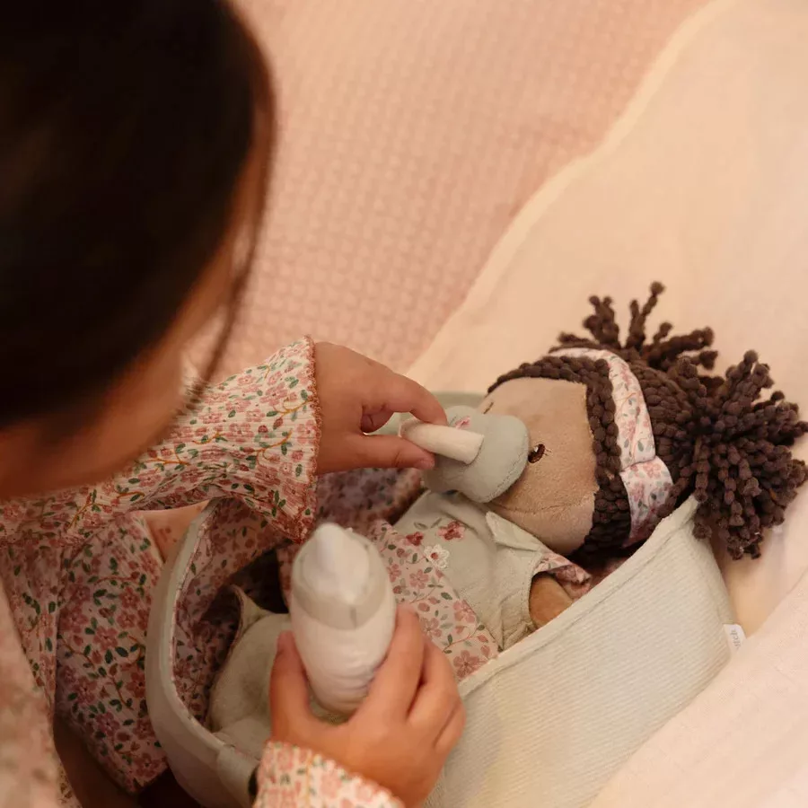 Látod gyermekeden, ahogy figyeli minden mozdulatodat, és utánozni próbálja, hogyan gondoskodsz a családról? A teljesen megújult Little Dutch Baby Evi a tökéletes társ ahhoz, hogy a kicsik biztonságos környezetben élhessék át a gondoskodás örömét. Ez a bűbájos, sötét hajú baba a puha, mentazöld mózeskosarában érkezik, és csak arra vár, hogy megetessék, tisztába tegyék és álomba ringassák. A mágneses kiegészítők és a levehető ruhadarabok valósághű élménnyé varázsolják a játékot, miközben észrevétlenül fejlődik gyermeked empátiája és finommotorikája.