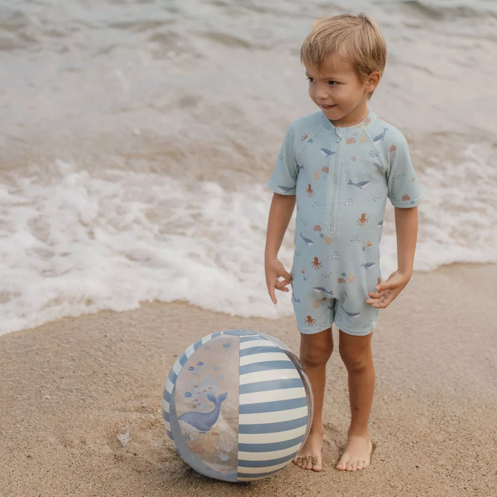 Képzeld el, ahogy a ragyogó napfény megcsillan ezen a csodaszép és váltakozó mintájú labdán! Az élénk tengerészkék és fehér csíkos panelek tökéletes, figyelemfelkeltő kontrasztot alkotnak a pasztellkék alappal. Ha jobban megnézed, ezen a lágy kék háttéren kelnek életre a legaranyosabb óceáni barátok: egy mosolygós bálna, egy kedves teknős és apró kis halacskák úszkálnak rajta. Amikor a gyermeked megfogja, a kellemesen sima felület azonnal felfedezésre csábít. Szinte érzitek a sós tengeri szellőt, amikor a magasba dobjátok. Ez a prémium minőségű strandlabda tökéletes választás a Little Dutch UV-szűrős fürdőruhák és poncsók mellé, így a teljes strandolós felszerelésetek varázslatos harmóniában pompázhat!