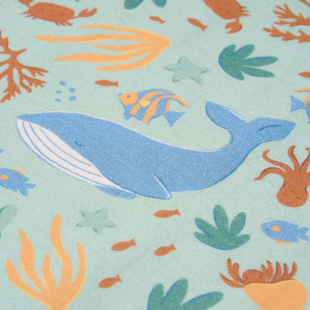 Képzeld el, ahogy a kezedbe veszed ezt a csodálatos darabot. Szinte tapintható a prémium minőség és a gondoskodás: a külső finoman gyűrt textúrájú muszlin anyag nyugtató, világoszöld alapszínben pompázik, melyet a varázslatos és színes tengeri állatkák – kis bálnák, vidám halacskák és tengeri csillagok – részletes mintája tesz igazán bájossá. Amikor kifordítod, a belső hófehér frottír réteg bolyhos puhasága azonnal rabul ejt. Nem csupán egy törölköző, hanem egy puha menedék a pancsolás után. Tökéletes választás a Little Dutch Ocean World kollekció UV-szűrős fürdőruhái és strandkalapjai mellé a tökéletesen harmonikus tengerparti megjelenésért.