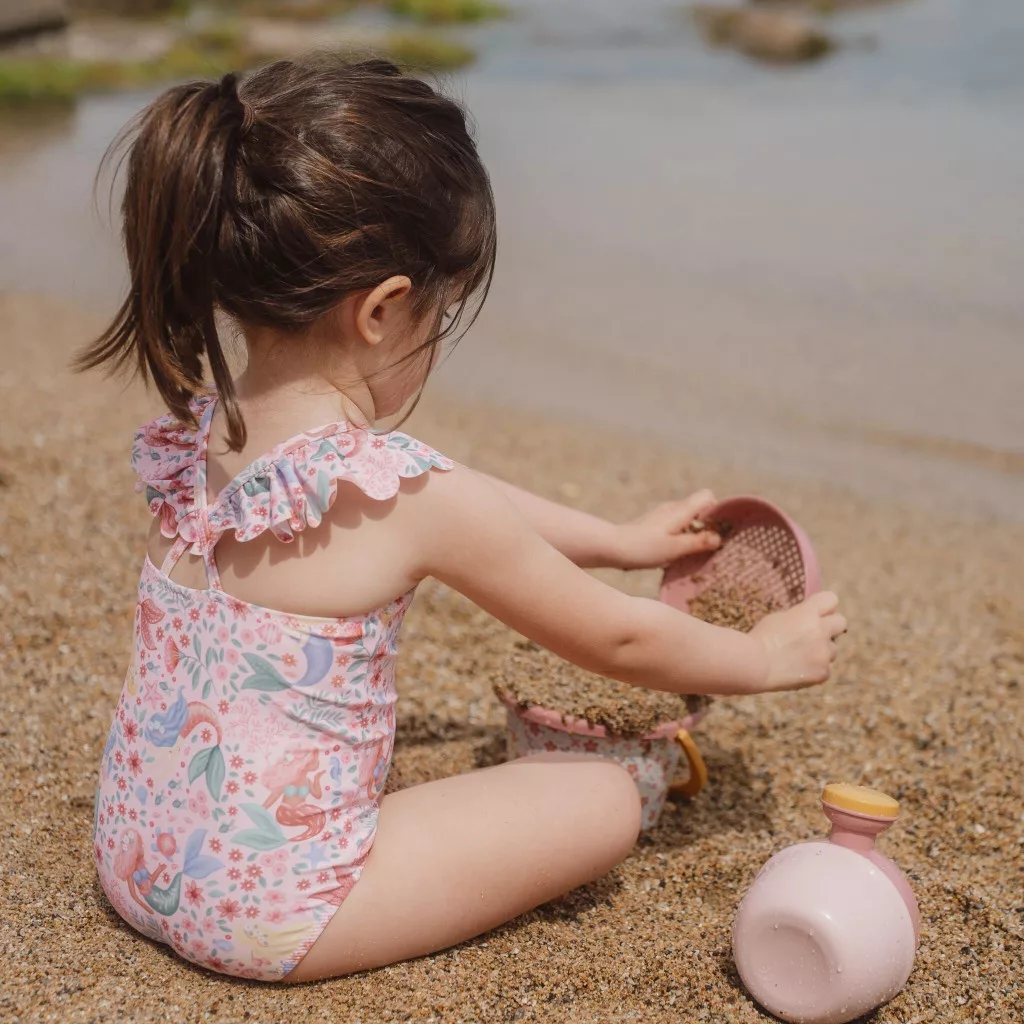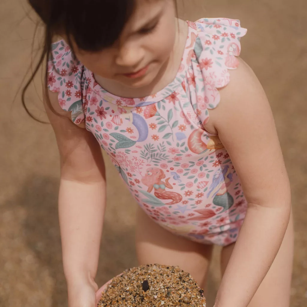 Képzeld el, ahogy kislányod ebben a pasztell rózsaszín csodában tipeg a medence partján. A lágy tónusú anyagon apró álmodozó sellők, tengeri csillagok és mosolygós óceáni barátok mintázata elevenedik meg, melyek azonnal elvarázsolják a babát. A hűvös, sima felületű textúra szinte egybeolvad a bőrrel, miközben a vállakat díszítő játékos fodrok minden lépésnél vidáman libbennek. Amikor pedig kézbe veszed, rögtön érzed azt a rugalmas, mégis tartós minőséget, ami az önfeledt pancsoláshoz szükséges. Tökéletes választás egy pihe-puha Little Dutch strandtörölköző vagy fürdőponcsó mellé, hogy a vízben töltött percek után azonnal melegbe burkolhasd a picit.