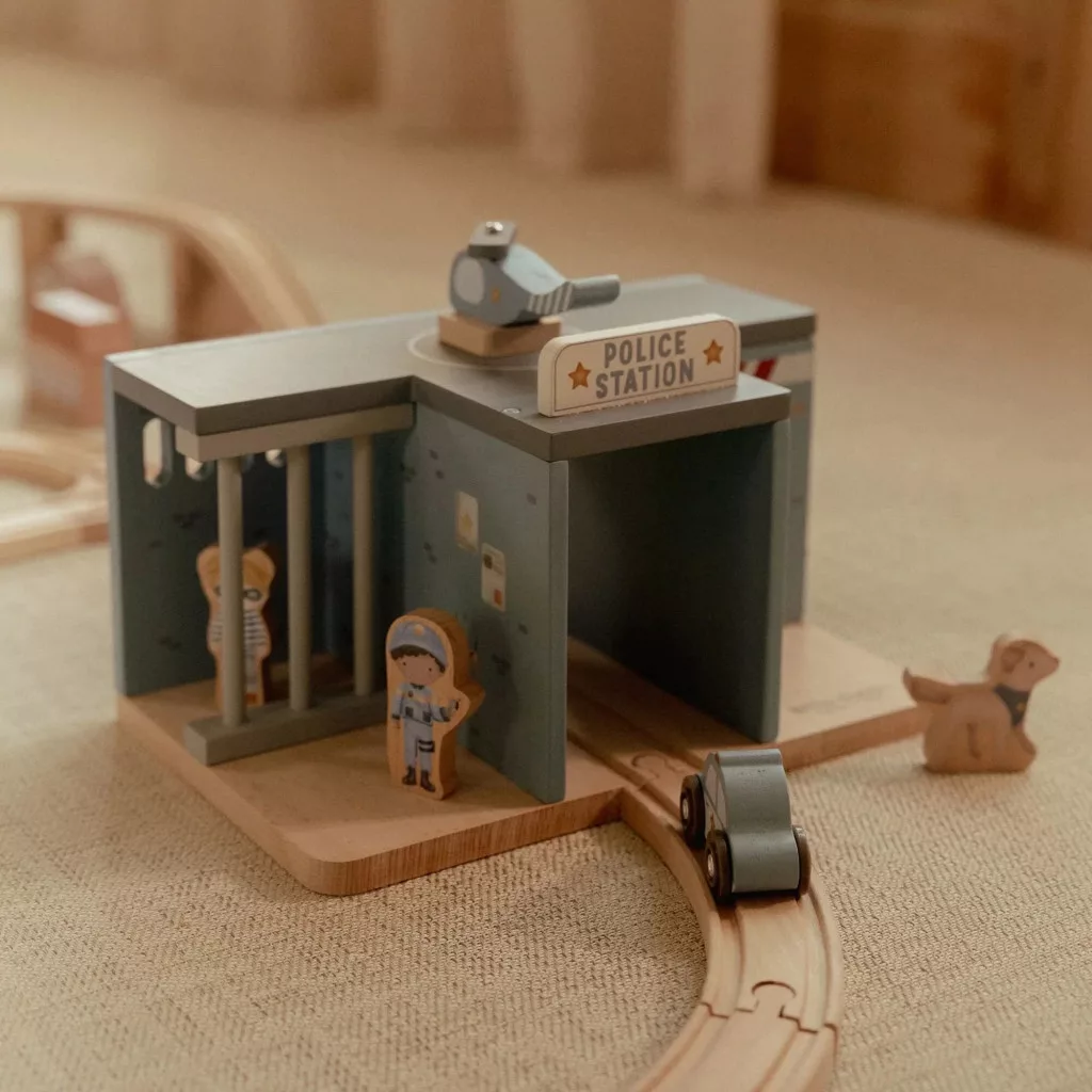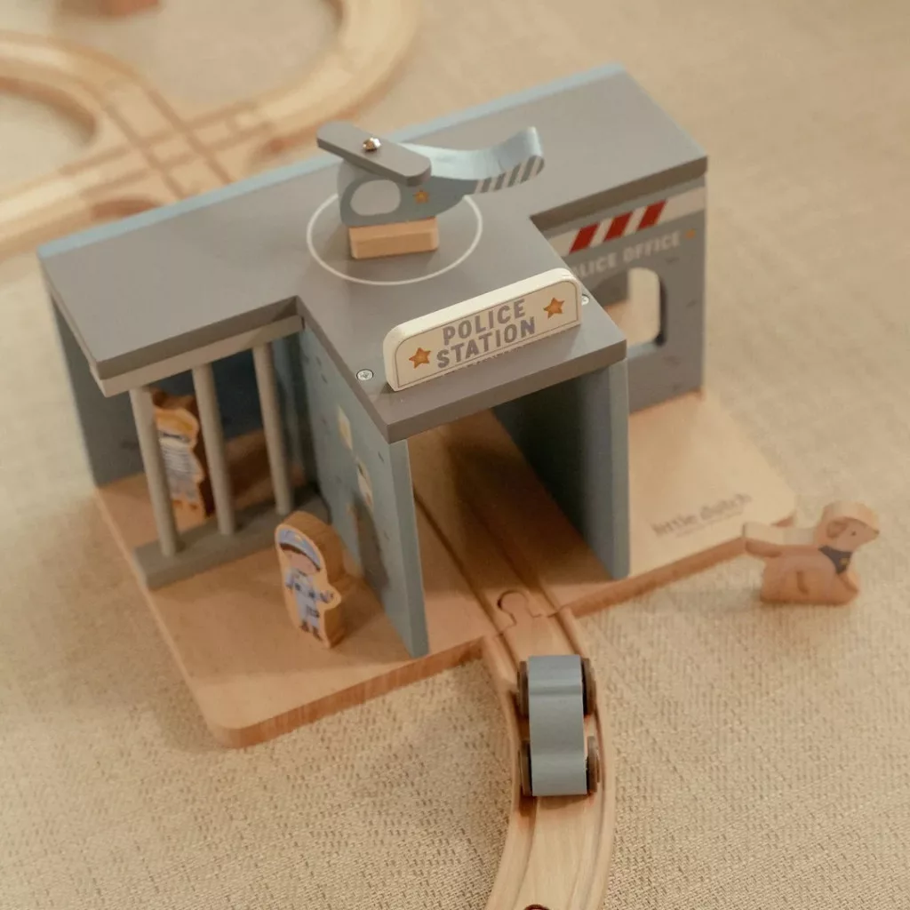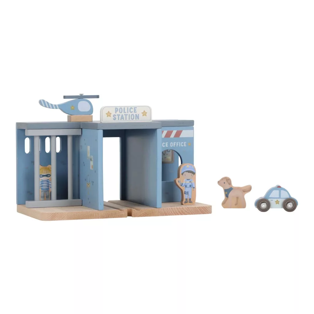 Megszólal a sziréna: a Little Dutch rendőrség készen áll, hogy rendet tartson a városban! Ez a fából készült rendőrőrs minden kelléket tartalmaz egy izgalmas üldözéshez vagy bűnügyi kalandhoz. Van benne rendőrautó, helikopter, bátor rendőr, egy huncut tolvaj és még egy hűséges rendőrkutya is.