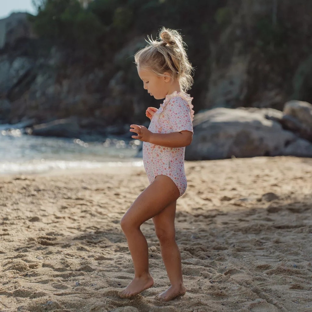 Képzeld el, ahogy a kislányod ebben a csodaszép, finom tapintású fürdőruhában fut a víz felé! A Dreamy Flowerfield kollekcióra jellemző púderes, lágy alapszín és az apró, romantikus vadvirágos minta azonnal rabul ejti a tekintetet. A vállakon és a mellrészen végigfutó elegáns, kecses fodor lenyűgöző kislányos bájt kölcsönöz a darabnak. Az anyaga kellemesen hűvös és selymesen sima, ami vizes állapotban sem dörzsöli ki a legérzékenyebb bőrt sem. Tökéletes választás a Little Dutch strandtörölközők és poncsók mellé, így a vízparti szettetek azonnal teljes és tökéletesen harmonikus lesz.