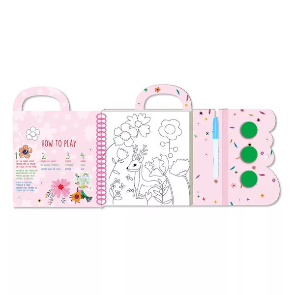 Színezd ki a fehér képeket a vizes ecset segítségével, mely a könyvben található. A játékhoz nem kell festéket használnod! A kép amikor megszárad, visszafehéredik így újra és újra kiszínezheted a "varázstolladdal". Használd a varázs nyomdákat is, melyeket szintén a könyv belsejében találsz.