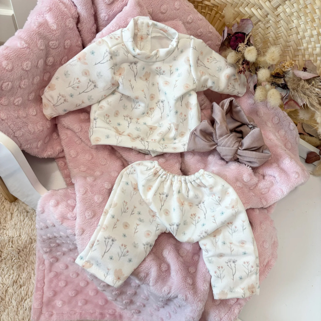 • pipa Stílusos megjelenés: A baba kétrészes virágmintás pizsamát és masnis fejpántot visel, ami azonnal elnyeri a kis divatrajongók tetszését.