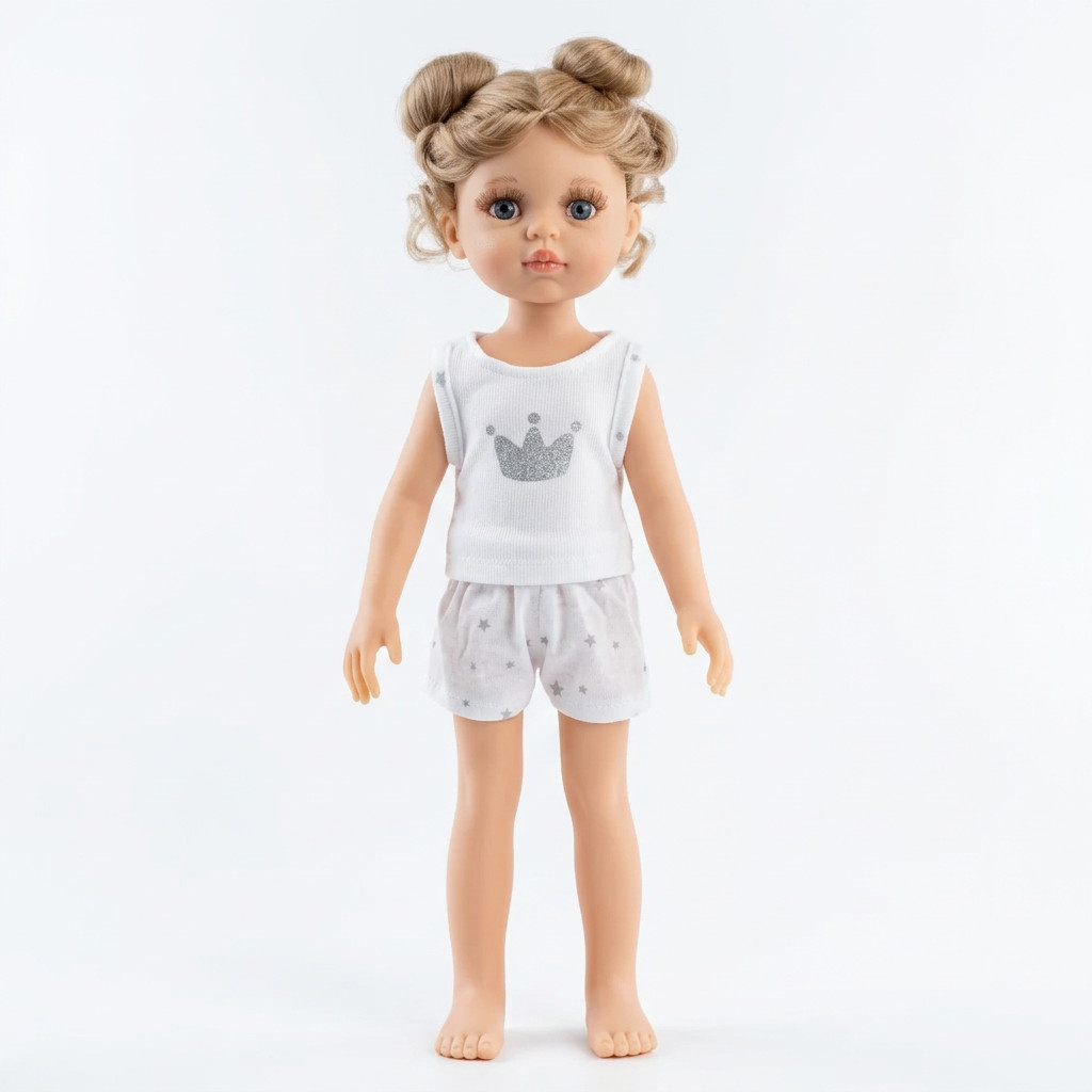 A Paola Reina Valeria baba 32 cm igazi álombarát a gyerekszobában. Két kis kontya és álmodozó tekintete azonnal magával ragadja a kicsiket, miközben a spanyol kézműves minőség minden részletében tetten érhető – a haj textúrájától kezdve a prémium, vanília illatú vinil testig.