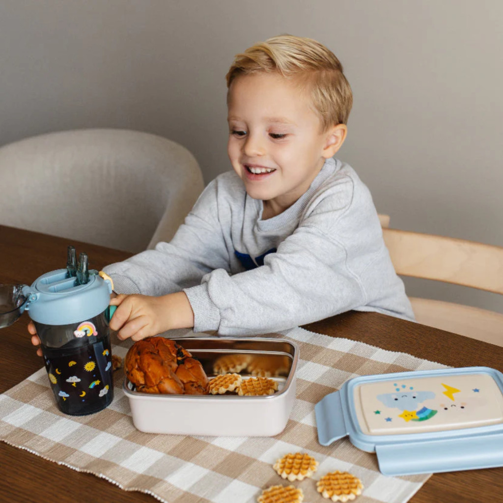 A Sparkling Sky doboz kézbe vételekor azonnal érezhető a minőség: a lágy kék szín és a selymes tapintású fedél harmóniája nyugalmat áraszt. A rozsdamentes acél hűvös érintése tisztaságot sugall miközben a vidám felhőcske és a szivárvány grafikája inspirálja a gyermeked fantáziáját az asztalnál töltött percek alatt. Ez a bento doboz több mint egy egyszerű tároló: egy apró szeletnyi gondoskodás amit minden reggel elcsomagolhatsz az iskolai táskába.