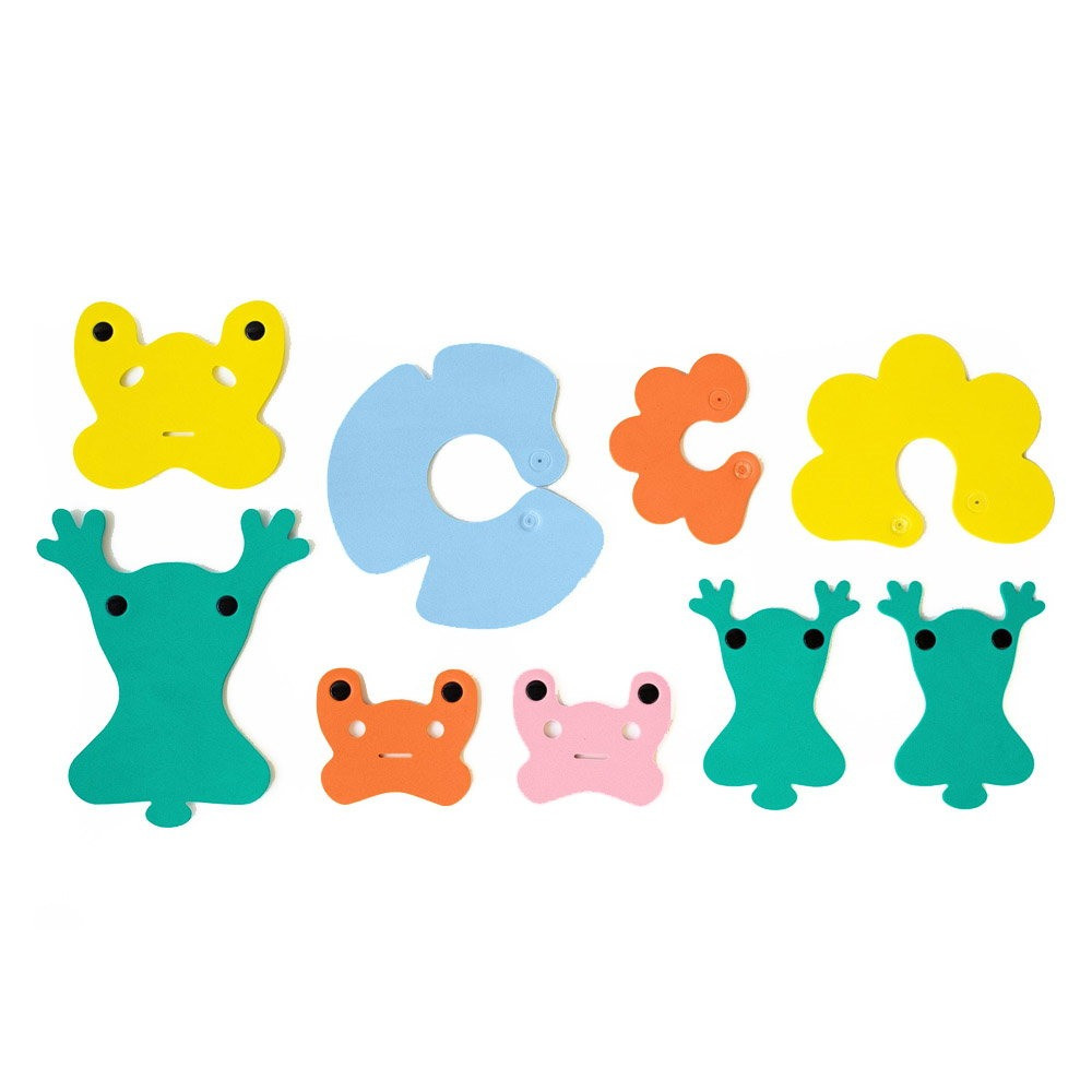 Képzeld el ahogy gyermeked pici ujjai között a pihe-puha habszivacs elemek egy-egy vidám figurává állnak össze. Az élénk színek és a kedves béka-arcok azonnal magukra vonzzák a figyelmet miközben az anyag lágyan siklik a víz felszínén. Ez a készlet varázslatos módon feltapad a kád falára is ha megnedvesítitek így a játék még változatosabbá válik. Remekül passzol a Quut Squeezi tengeralattjáróhoz is hiszen együtt egy teljes vízi birodalmat alkothatnak a fürdőszobában.